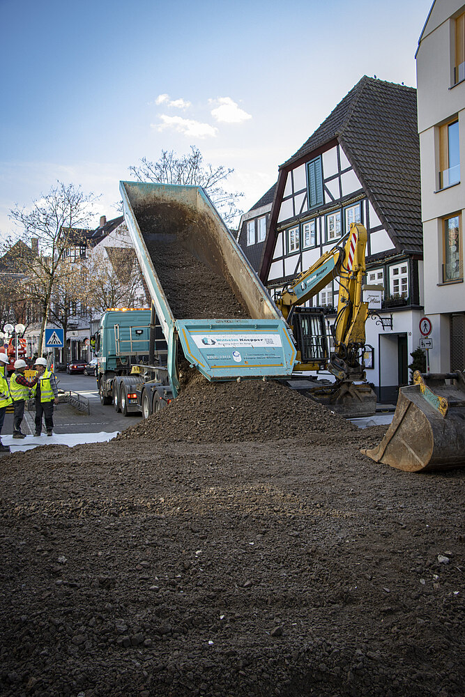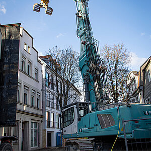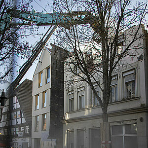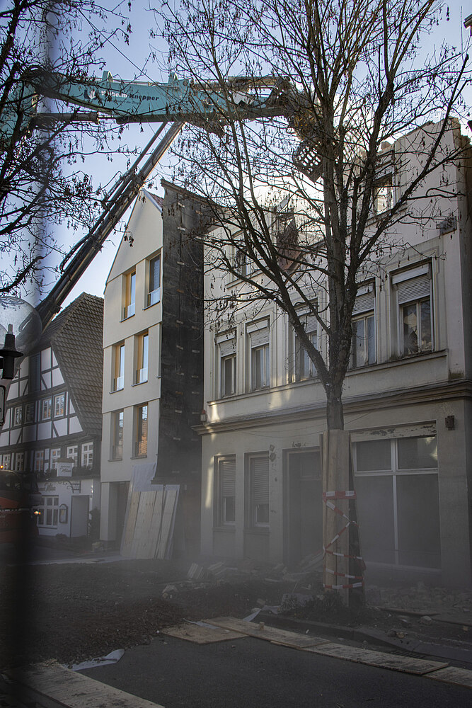 - Demolition of the building using a demolition curtain to protect the neighboring buildings and road traffic up to the lower edge of the floor slab/foundations