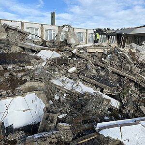 The fact that the opposite part of the barracks site was being used as a fully occupied refugee home was just one of the challenges. In order to achieve a high level of security and keep children in particular away from the demolition site, the first measure was to erect secure fencing. At the same time, proper traffic management had to be guaranteed. The ongoing operation of the refugee home also made it necessary to reconnect the supply lines for water, electricity and heating. As part of the barracks site was classified as a suspected explosive ordnance area, the district government's explosive ordnance clearance service had to come and carry out an inspection first. Another unplanned challenge was not long in coming. During demolition, it was discovered that the roof consisted of up to seven layers of roofing felt containing tar, which first had to be removed separately. Not everything can be determined during a site inspection. Bernhard Camminadi emphasizes the excellent communication: "I would like to expressly praise this. That's how I imagine good cooperation works. That what you say is kept to. That's why we quickly found a satisfactory solution for the roofing felt."