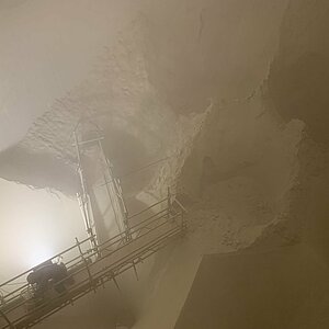 The next step was to clean the silo by hand. Two employees on the cantilevered scaffolding gradually chiseled and loosened the material. Electric hand-held chisels were also used on the silo walls to remove the adhering material. At the same time, one employee kept a constant watch on the access hatch and checked that his colleagues inside were OK. The other two employees worked on the outlets. They regularly and very carefully opened the latches to allow the loosened material to flow out. Each time, around 3,000 to 4,000 liters of cement escaped at once, which had to be transported to an SKW via conveyor belts. The material that fell next to it was transported back onto the conveyor belt by loader. Within three months, the entire silo was cleaned without any incidents. The customer, HeidelbergCement, had expected more difficulties and was impressed by how easily a problem of this magnitude could be solved with the help of a creative demolition specialist like Knepper. Robert Schnatz was also particularly impressed by the discipline of the Knepper team: "Despite the difficult visibility conditions and freedom of movement when working in the silo, everyone adhered very consistently to the work safety measures."