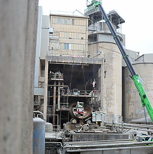 Am Anfang standen für Geschäftsführer Carsten Knepper und Kalkulator Max Hohner mehrere Ortstermine an. Dabei wurden Ideen diskutiert und wieder verworfen, um für den Kunden den kostengünstigsten Lösungsweg zu finden und das Projekt verlässlich kalkulieren zu können. Vorteil für die OPTERRA Wössingen GmbH: Die Ofenlinie und die dazugehörigen technischen Anlagen bestanden zum größten Teil aus Stahl, der recycelt werden konnte. Die Vergütung des Stahlschrotts minderte die Abbruchkosten – ein wichtiger Faktor für OPTERRA. Knepper ist deutschlandweit sehr gut im Schrotthandel vernetzt und verfügt über eine jahrzehntelange Expertise. Dadurch konnten für die rund 1.500 Tonnen Stahlschrott optimale Vermarktungserlöse erzielt werden. Christian Zenner, Investitions- und Entwicklungsleiter bei OPTERRA und zuständig für die zukünftige Technik im Zementwerk, erklärt: