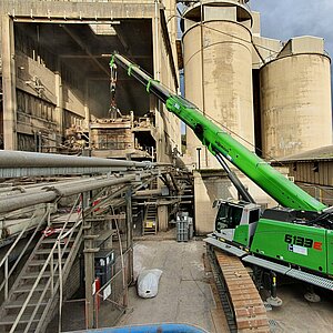 Um Platz für den Mobilkran zu schaffen, wurden zunächst Anlagen am Boden demontiert. Das Knepper-Team arbeitete angegurtet von einer extra gesicherten Hebebühne aus, um die Filter und Fassadenelemente in Stücke zu schneiden. Den Abwärtstransport der bis zu 10 Tonnen schweren Teile übernahm der Teleskopkran. Beim Rückbau des 60 Meter hohen Schornsteins kam geballte Power in Form von zwei mobilen Teleskopkranen zum Einsatz – ein seltener Anblick. Die spektakulären Arbeiten des Knepper-Teams fanden unter den wachsamen Augen und der Kontrolle des Technikmanagers OPTERRA statt, denn die Produktion im Werk lief weiter. Die Einhaltung der strengen Sicherheitsvorschriften war daher oberstes Gebot. Pedro Cano berichtet: „Die Verantwortlichen erkannten nach kurzer Zeit, dass wir sehr sauber arbeiten und brachten uns viel Vertrauen entgegen.“